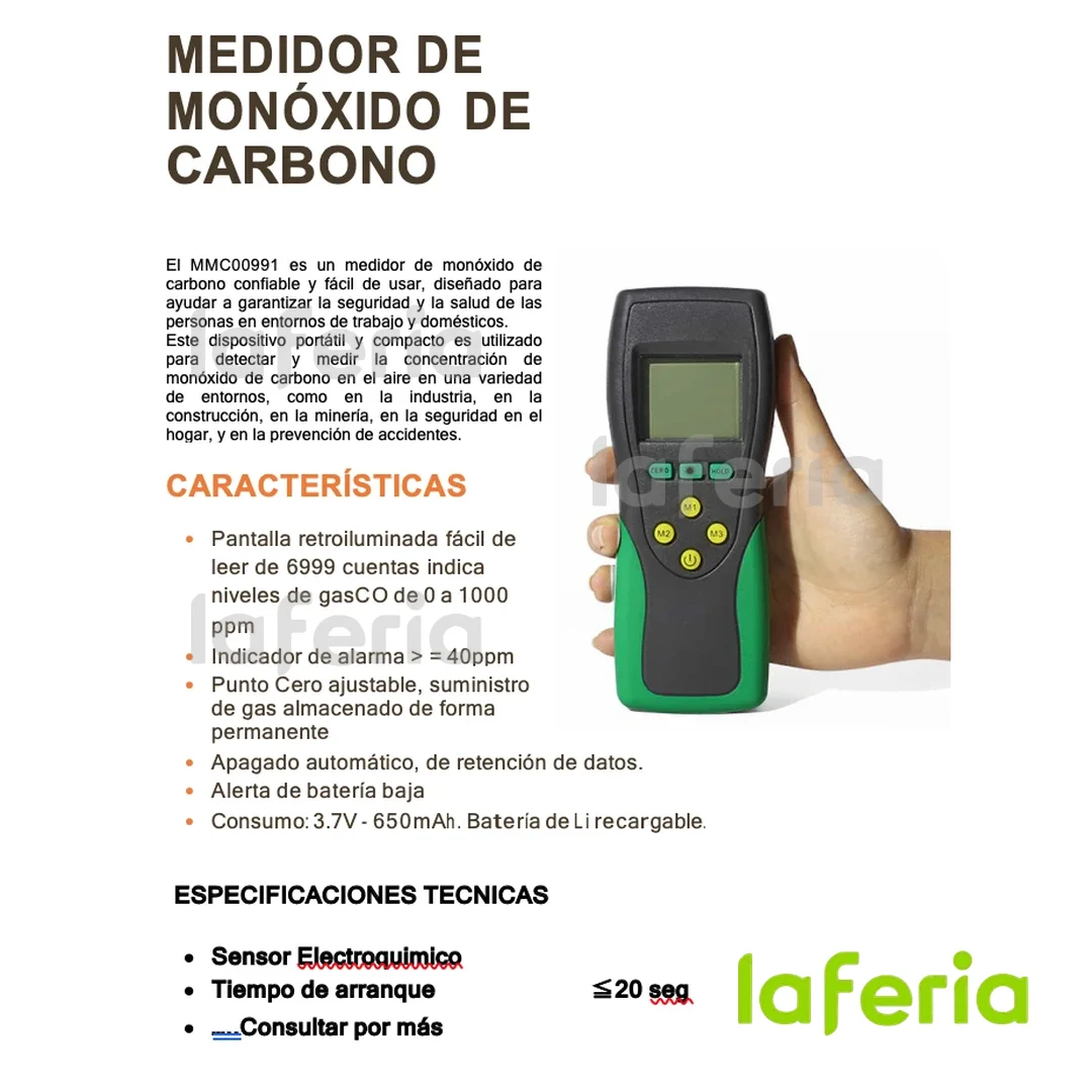 • Pantalla retroiluminada fácil de leer de 6999 cuentas indica niveles de gas CO de 0 a 1000 ppm